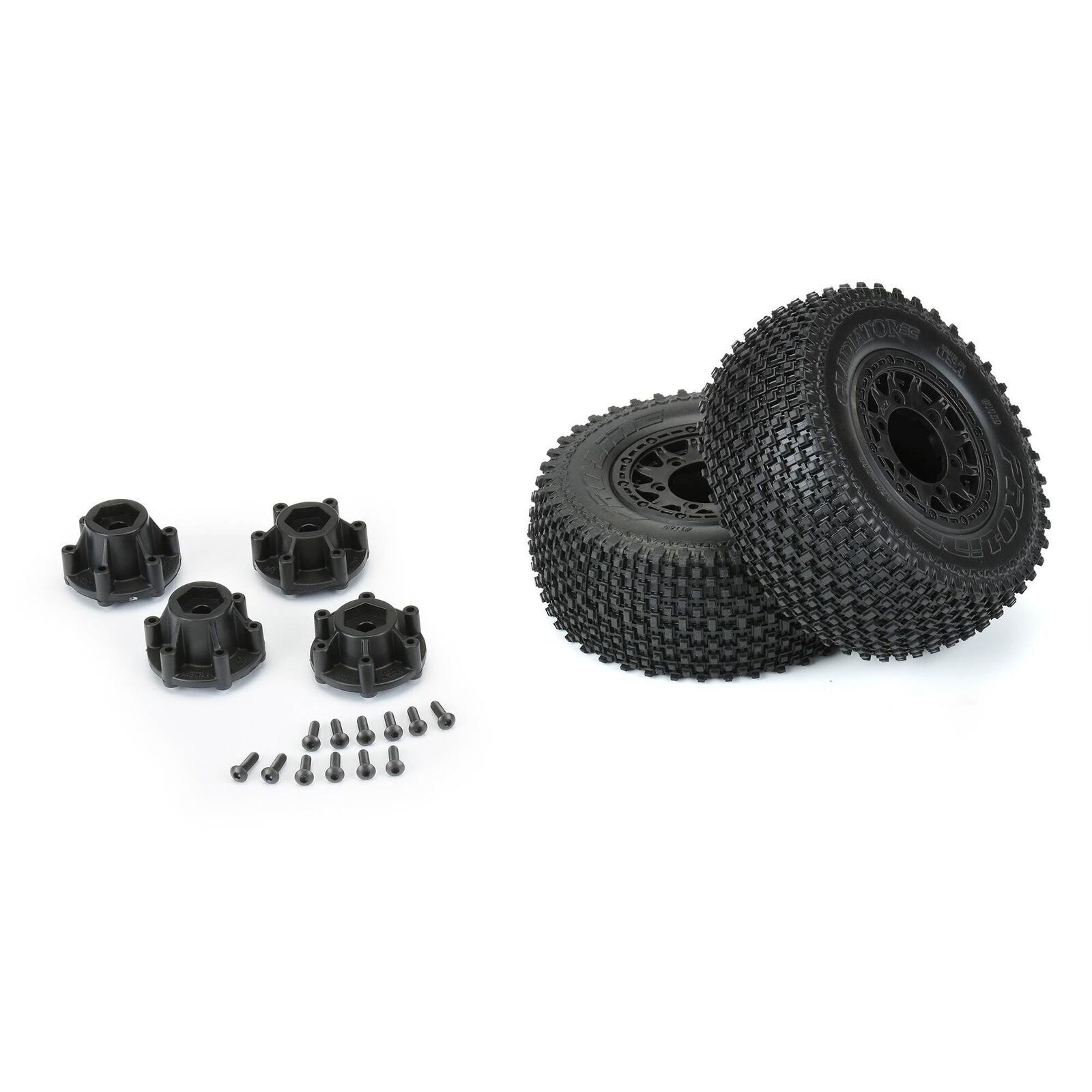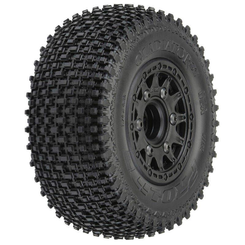 This is a pair of pre-mounted Gladiator SC Tires on Raid Black 6x30 Removable Hex Wheels. The Gladiator tread is an icon in the world of RC because of its unmatched traction and durability on a variety of surfaces. For over a decade, Gladiator tires have been tearing up bash and race spots around the World. Now, Pro-Line Racing is bringing the Gladiator tread to your Short Course Truck so you can dominate the terrain! The Gladiator tires are designed to give your short course truck optimal traction on any surface, while also giving you the durability that you are searching for.