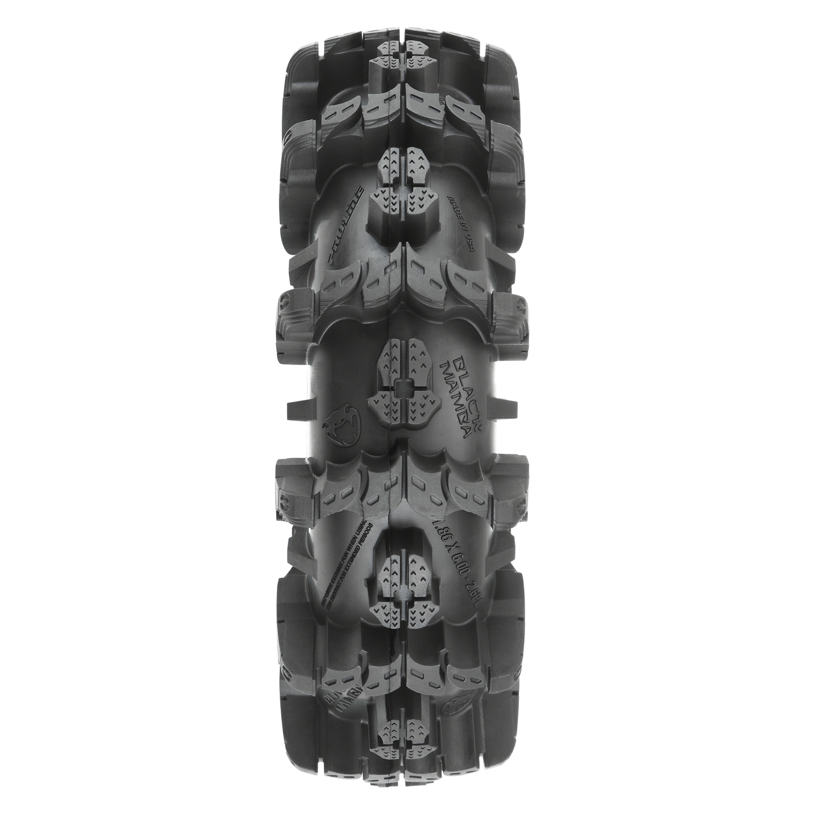 This is a pair of Interco Black Mamba 2.6" Mud Truck Tires. Pro-Line is proud to announce fully licensed Interco Black Mamba 2.6" tires specifically designed for extreme mud truck action! These massive 6" tall x 1.86" wide tires are perfect if you are looking to do some Mud Bogging with your rig. Transform your Black Mamba tires into an even narrower and more extreme mud tire when you combine them with Pro-Line's Vice CrushLock 2.6" Bead-Loc wheels (2789-03).