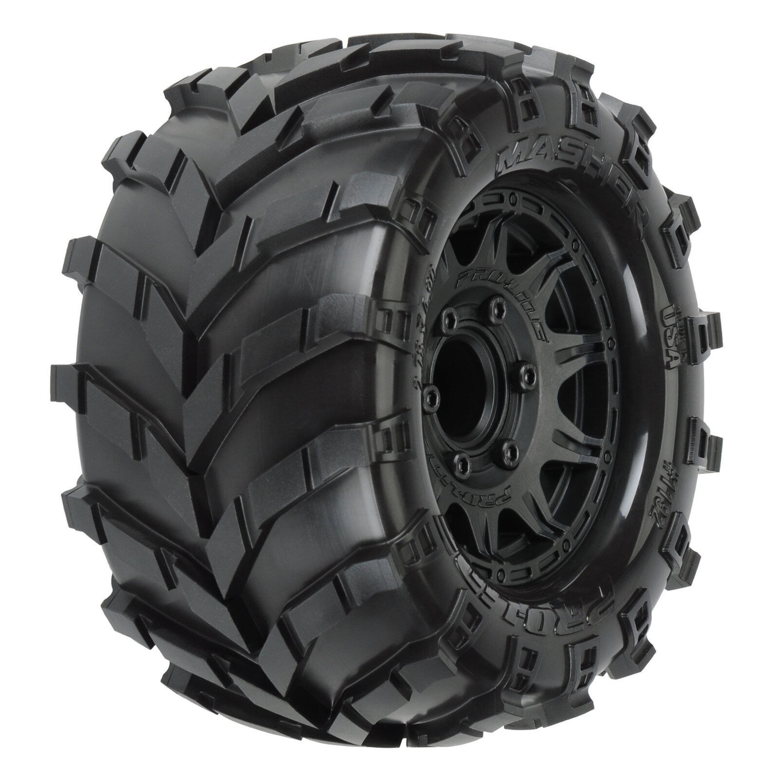 This is a pair of pre-mounted masher 2. 8" tires. Pro-line is very excited to announce the availability of the masher 2. 8" pre-mounted to the wheel that you need. We take the guesswork out of your glue job by doing the mounting for you so you can spend your time having fun! The ultra-modern chevron tread digs deep into the roughest and toughest terrain and looks mean doing it. The side tread of this behemoth tire features a hook shape that craters the dirt and achieves unparalleled side traction. After fitting your truck with this massive masher tread, you'll be ready for back yard thrashing and mashing on any neighborhood terrain