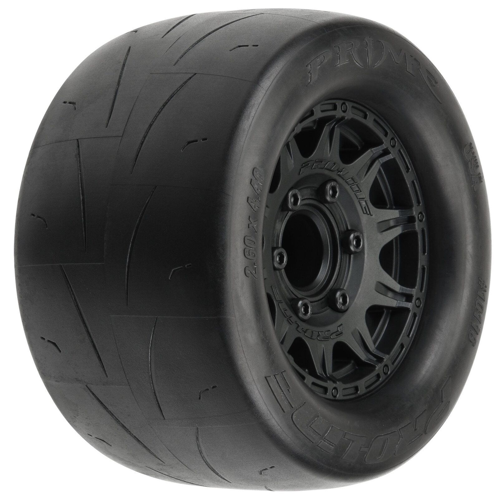 This is a pair of pre-mounted Pro-Line Prime 2.8" Tires. Pro-Line has a new Street Tire for 2.8" Monster Truck fans specifically designed for High-Speed fun! We take the guesswork out of your glue job by doing the mounting for you so you can spend your time having fun! The Prime 2.8" is almost a complete slick tire that will put the maximum amount of rubber down on asphalt and concrete for incredible traction. The smooth sidewall of the Prime 2.8" allows for controllable slides and burnouts on the street where normal treaded tires would cause the dreaded catch and flip. Bring a whole new level of street fun to your 2.8" Monster Truck with Pro-Line's new Prime!!