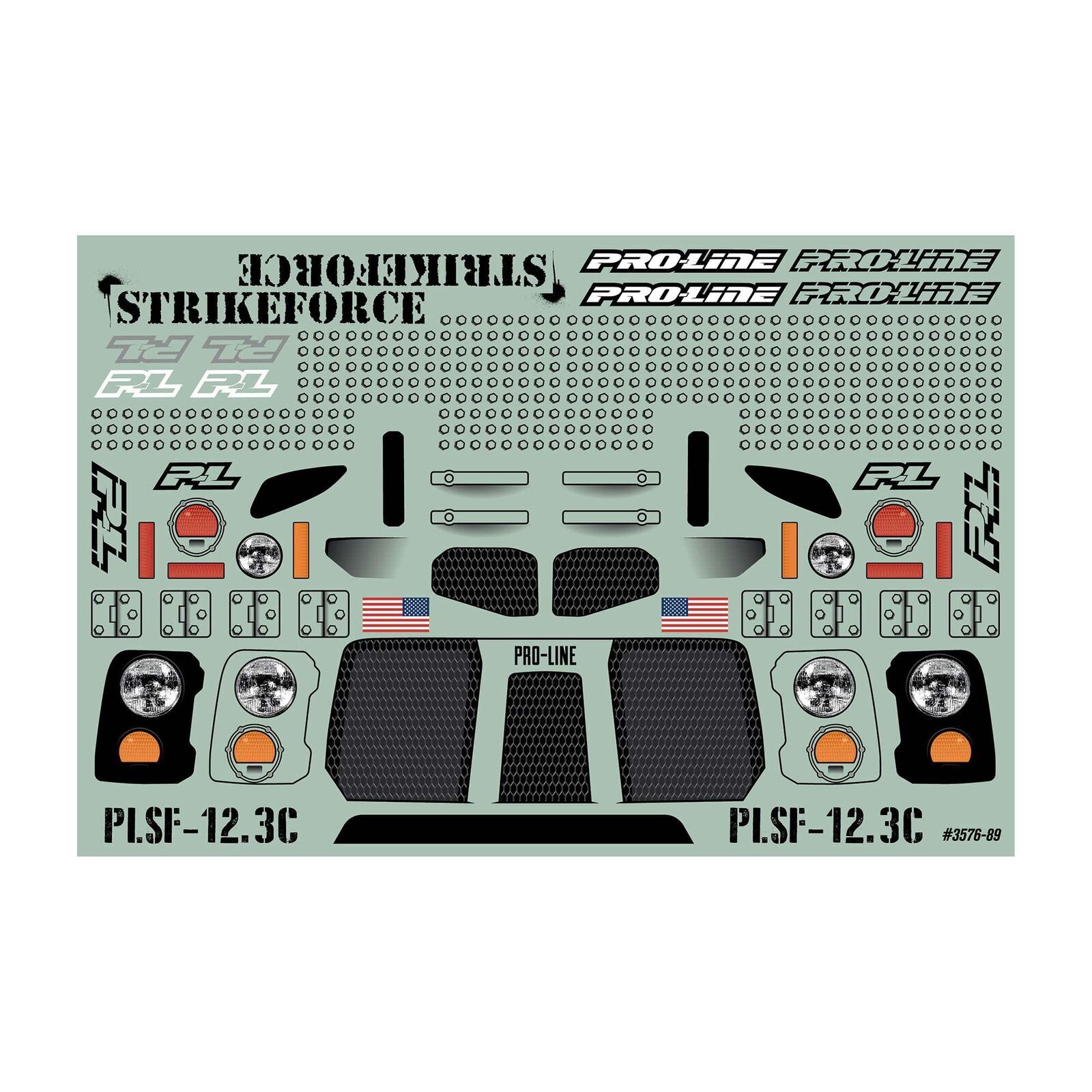 The strikeforce is molded in our durable. 060" polycarbonate and comes with window masks, paint-then-peel overspray film, and decals. Complete your strikeforce with pro-line's military-inspired paint set (6323-04)! Now is the time to strike - get your own pro-line strikeforce body for your 12. 3" crawler now!