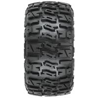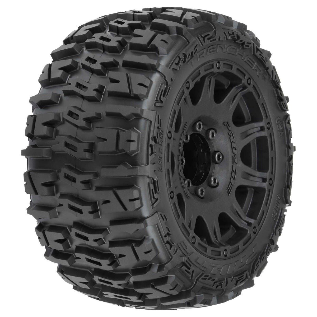This is a pair of pre-mounted Trencher LP 3.8" Monster Truck Tires. Pro-Line is stepping up the 3.8" tire game for TRAXXAS MAXX fans with the all-new Trencher LP 3.8" tires! The Trencher LP tires are designed to give your MT optimal traction on just about any surface and come in at 2.96" wide by 5.6" tall making it perfect for your MAXX or Low Profile 1:8 Monster Truck build. Super cool horizontal H shaped treads give your MT ridiculous amounts of forward bite and with the super tall Trencher tread, you'll find that durability and longevity you have been searching for.