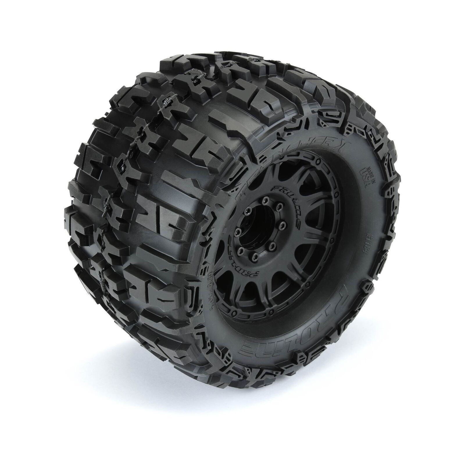 This is a pair of pre-mounted Trencher X 3.8" All Terrain Truck Tires. Leave a mark with your Monster Truck wherever you are with Pro-Line's Trencher X tires. The Trencher X tires are designed to give your MT optimal traction on just about any surface. Super cool horizontal H shaped treads give your MT ridiculous amounts of forward bite. With tread height at 1/4" tall, you'll find that durability and longevity are second to none.