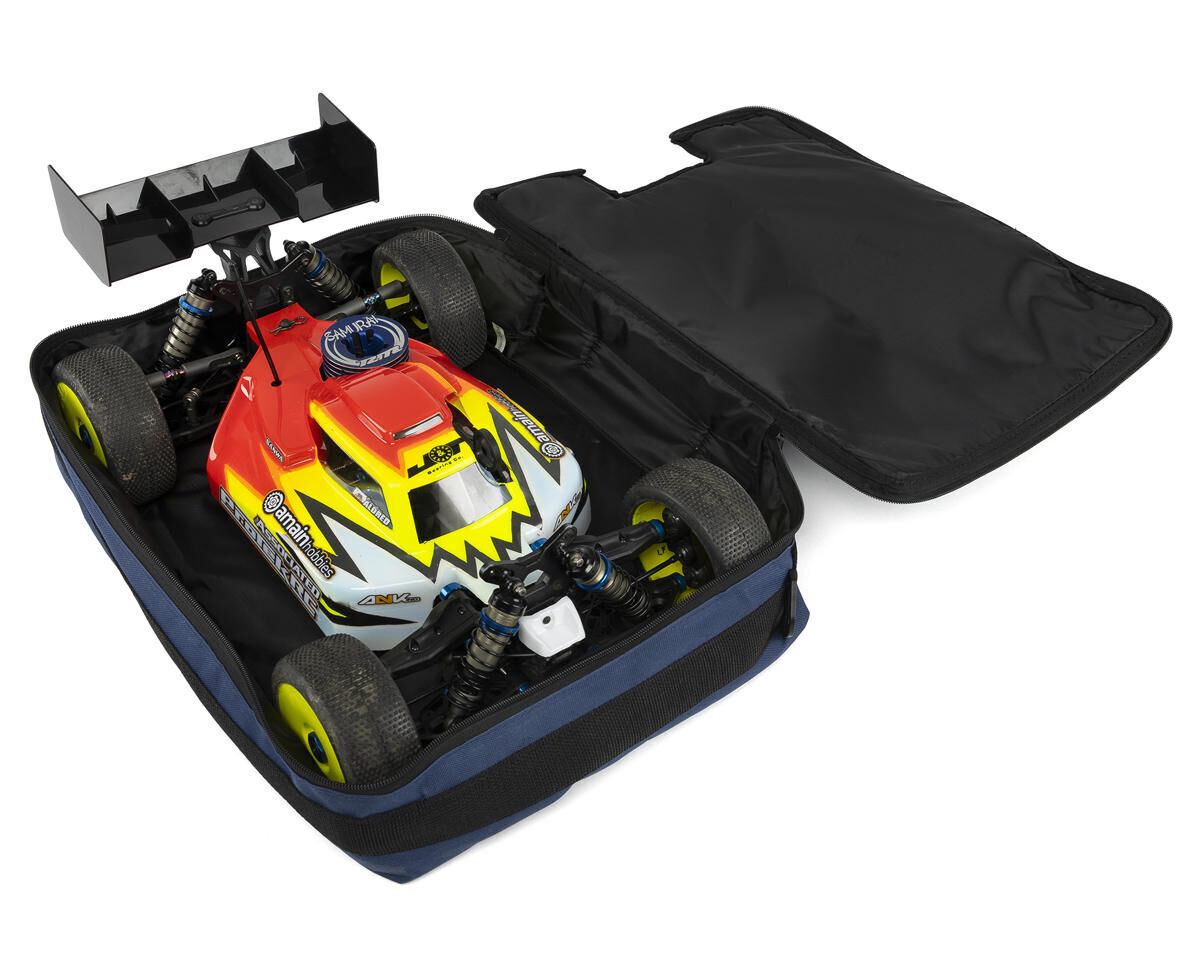 The protek r/c 1/8 buggy carrying bag is a clean and convenient way to transport your buggy. Designed for racers looking for a convenient solution to transport a nitro or electric buggy, the bag is a great way to keep your buggy from rolling around in your car or back of your truck, containing all the dirt and grime after a long day at the track. It also fits great on top of your hauler bag when loading or unloading at the track. The protek r/c carrying bag is big enough to fit one 1/8 buggy with body and tires attached. Two durable zippers close the lid, meeting at the wing stay, leaving the wing exposed. For easy carrying, grab the wing, the side handle on the bag, or attach your own shoulder strap to the two plastic latches. The bag is also carry-on sized so it works great for plane flights. The bag is constructed from a three-ply design, using easy-to-clean durable material on the outside and inside, with a thin layer of foam padding sandwiched between. This allows the buggy to stay safe during transport, or while stored in your shop. At the races, roll the bag up until you need it again. Features: fits 1/8 buggies with tires on contains all dirt and grime inside foam padded carry-on sized for flights can be rolled up when not in use convenient side carrying handle can be used with optional shoulder strap specifications: fits: 1/8 buggy w/body and w/tires dimensions (w x l x h): 13. 38 x 18 x 5. 70in (34 x 45. 5 x 14. 5cm) fits body: yes fits wing: yes, but exposed shoulder strap: can be used, but is not included (ptk-8114)