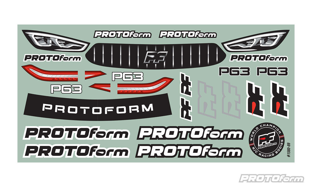 This body is designed to meet Global Body Spec rules and is made in the USA from high-quality, super-durable polycarbonate. It's available in three weights: X-Lite (0.4mm, for expert drivers only), Pro-Lite (0.5mm, a good all-around option), and Light Weight (0.65, for novice drivers or windy outdoor conditions). Included with the P63 are our convenient plastic wing buttons and under-wing "nuts", with M3 mounting screws. A stylish decal sheet, window masks, and overspray film complete the package.