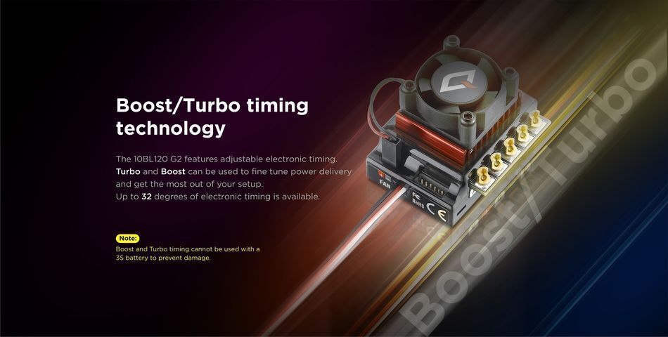 Introducing the Hobbywing QuicRun WP 10BL120 G2 - Brushless Electronic Speed Controller. Intelligent freewheeling technology, greatly improved performance. The innovative intelligent freewheeling technology enables higher driving efficiency and lower operating temperature of the ESC, and further improves the stability and reliability of the ESC. Powerful built-in BEC The ESC has a built-in BEC with a continuous current of 5A and supports a maximum output current of up to 10A. The output voltages are switchable between 6V, 7.4V. This ensures that the ESC is able to support the demanding high-torque servos in the market. Efficient cooling system The integrated radiator design, combined with the patented copper thermal conduction sink on the internal power board of the ESC, facilitates the rapid conduction of internal heat to the radiator, and the fan is added to dissipate heat. This results in an efficient heat dissipation system to ensure that the ESC is always performing at its best. Capacitor Thermal Protection Capacitor thermal protection is designed and implemented into the ESC to effectively prevent capacitors from exploding and causing irreversible damages to the ESC due to overloading. Built-in capacitor Super large built-in capacitor, The built-in capacitor of the ESC is as high as 1640uF. External capacitors are not needed for 10th scale models on the market and helps improves ease of use. High protection level, all-weather operation The IP-67 waterproof Rating guarantees excellent waterproof and dustproof protection. The whole power system is able to drive on a variety of surfaces including mud, sand, ice, snow and water without damaging the power unit. Specifications Type Scale - 1/10th Brushed/Brushless - BL Sensored/Sensorless - SL Waterproof - Yes Specifications Cont./Peak Current - 120A/760A Input Voltage - 2-4S LiPo BEC Output - 6V/7.4V@5A Wires & Connectors Input Wires - Black-14AWG-200mm*2 Output Connectors - 4mm Gold (female) ESC Programing via SET Button on ESC - Not Supported LED Program Box - Supported LCD G2 Program Box - Supported OTA Programmer - Supported Program Port - Separate Program Port Firmware Firmware Upgrade - Not Supported Size & Weight Size - 52.9 x 39.8 x 38.2mm Weight - 119g (Including wires & connectors) Applications Motors - SL BL Motors / SD BL Motors (only in sensorless mode) Vehicles - 1/10th Short course truck,Monster truck KV Rating/T Count - 3652?3660 Size Motor (HW30125002)