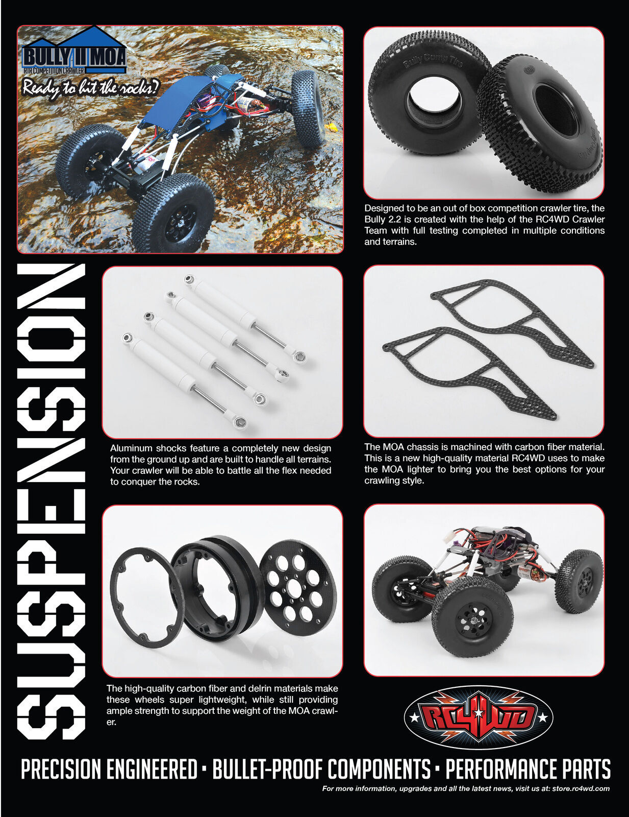 The bully 2. 2 moa competition crawler is a full out of the box, ready to compete crawler kit. The bully 2. 2 offers unmatched features that include carbon fiber chassis, bully 2. 2 competition cnc machined axles, aluminum shocks, titanium links, carbon fiber and delrin rocker 2. 2" beadlock wheels and bully advanced xs22 compound competition tires.