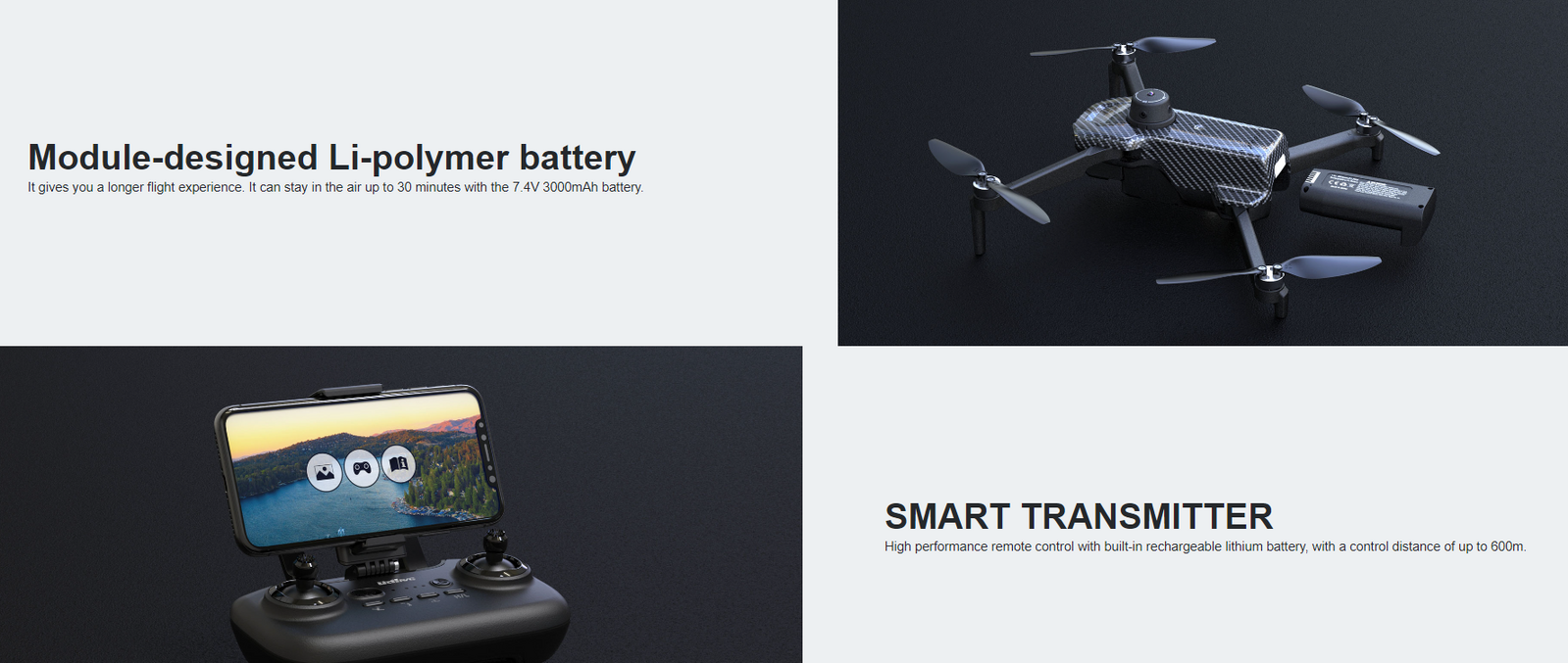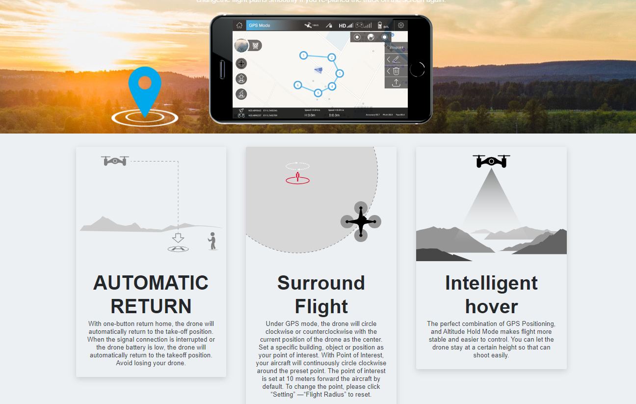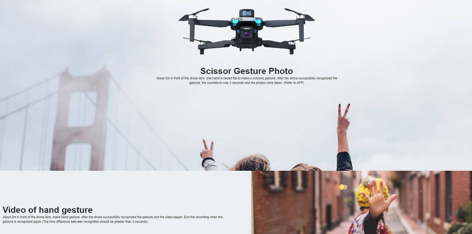 1.Gesture Photo/Video 2.Following up 3.GPS Positioning 4.Custom flight route mode,Surround Flight 5.With Infrared 6.Video Editing 7.MV: Filters, video effects, added background music, photo/video sharing 8.LED fill light assist 9.Time-lapse shooting 10.Stunt fly: One button away, skyward, spiral flight 11.App version:IOS 9.0 or later/Android 5.0 or later 12.Wifi Transmission:5G 720P 13.Gimbal lens adjustable Angle 90° Model: U95 Weight (typical value): 196.2g Folded size: 152×98×83mm Diagonal: 300mm(Diagonal motor shaft spacing) Propeller radius: 70.5mm Maximum ascent rate: 4.0m/s Maximum descent rate: 2.5m/s Maximum speed: About 24km/h Flight altitude limit: 250m Flight time: 28-32 minutes(calm) Wind speed: About level 3 GNSS: GPS / GLONASS Operating frequency: 2.4Ghz / 5G wifi Operation Frequency: 2.4Ghz Transmission distance: 300-600m (no outdoor interference) Battery: 3.7V, 1200mAh rechargeable lithium battery (built-in) Mobile phone holder: smartphone App Name: RC-Wing Image transmission system: 5G wifi Real time image transmission: 720 P@20 fps Operation System: Suitable for mobile phones in the IOS 9.0 or later and Android 4.4 or later system GPS Positioning, Optical Flow Positioning, Altitude Hold Mode, APP Control, Follow Me, Auto Return Home, Functional Waypoints, Surround Flight, Real-time FPV, One button take off/landing, Up, Down, Forward, Backward, Turn left/right, Fly left/right Image resolution: 3840×2160P Static Photography Mode: Single shoot Video Resolution: 1920×1080 P Image mode: RGB Frame Rate: 25 File System Support: FAT 32 Image format: JPEG Video format: MP4, H.264 TF Card: Not Supported Gimbal Stable: single axis?tilt? Controllable range: tilt -90 ° to 0 ° Flight Battery Capacity: 3000 mAh Voltage: 7.4 V Battery Type: LiPo Net Weight: 112 g Charging time: about 6h Charger Input: 5V ? 2A (UDI-U95)