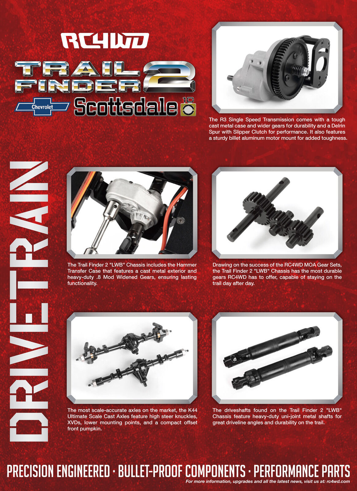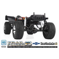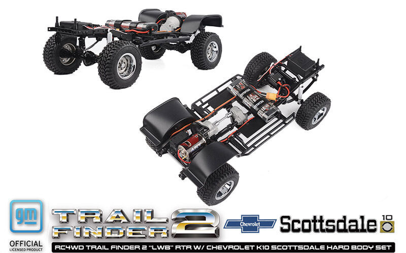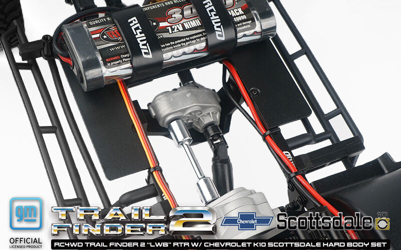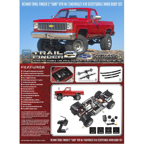 RC4WD Trail Finder 2 ""LWB"" RTR W/ Chevrolet K10 Scottsdale Hard Body Set (Red) Take a trip down memory lane with the RC4WD Chevrolet K10 Scottsdale Hard Body Complete Set! This stunning 1/10 scale replica captures the iconic details of the Scottsdale trim level found on K10 trucks from the 70s! Now available in two premium painted colorways, Red and Black! Featuring a molded drop bed, functional tailgate, molded interior, an opening hood, two interchangeable grills, and a V8 engine bay, this model comes packed with scale details! Under the hood, the engine bay features a dress-up kit and premium additions. The Trail Finder 2 LWB chassis has an industry 12.3' wheelbase and comes loaded with an R3 Single Speed Transmission, 540 45T Crawler Brushed Motor, Lift Blocks, RC4WD Ultimate Scale Shocks, and Outcry III Waterproof ESC, providing trustworthy performance! For a smoother ride, this setup comes equipped with our Super Soft Leaf Springs, two installed in each corner, and extra leaf springs in the parts bag to fine-tune your suspension needs! 1/10 Chevrolet K10 Scottsdale Hard Body Complete Set Chevrolet Blazer Chrome Front Grille w/ Optional Inserts Small Block V8 Engine Bay for Chevrolet Blazer and K10 w/ Dress Up Kit Rally 1.9"" Beadlock Wheels (Silver) RC4WD BFGoodrich Mud Terrain KM 1.9"" Scale Tires K44 Ultimate Scale Cast Axles (XVD) Super Scale 70mm White Shocks w/ Internal Springs Super Soft Flex Leaf Springs for TF2 540 Crawler Brush Motor 45T R3 Single Speed Transmission Center Mounted Hammer Transfer Case Twister High Torque Metal Gear Digital Servo Outcry III Waterproof Esc 6-Cell 3000mAh Battery w/ XT60 Plug RC4WD Marlin Crawler Side Plastic Sliders for TF2 LWB Front Inner Fender Set XR3 3-Channel 2.4Ghz Transmitter/Receiver Radio Universal Nimh Peak Battery Charger Hammer Transfer Case Ratio: 1.47:1 Gears: Wide .8 Mod Hardened Steel Gears Features: 8 Bearings, Cast Casing, Hardened Gears R3 Scale Single Speed Transmission Ratios: Pinion/Spur 14/64 = 1:4.57 Internal Ratio: 1.78:1 Gears: Wide Steel .8 Mod, Delrin Spur, Slipper Clutch K44 Ultimate Scale Cast Axles Ratio: 2.67:1 Hex To Hex Width: 177mm (6.96"") Shock Absorbers Super Scale 70mm White Shocks with Internal Springs Wheels Type: Rally 1.9"" Beadlock Wheels (Silver) Hub: 12mm Hex Width: 1.29in / 33.0mm OD: 2.14in / 54.0mm Tires Type: RC4WD BFGoodrich Mud Terrain KM 1.9"" Scale Tires Outer Diameter: 100.0mm (3.9"") Width: 42.0mm (1.65"") Inner Diameter: 48mm (1.89"") TF2 Truck Dimensions Wheelbase: 312mm (12.3"") Width: 220mm (8.7"") Height: 238mm (9.4"") Ground Clearance: 61.6mm (2.4"") Final Drive Ratio: 31.9:1 DRIVETRAIN The R3 Single Speed Transmission comes with a tough cast metal case and wider gears for durability and a Delrin Spur with Slipper Clutch for performance. It also features a sturdy billet aluminum motor mount for added toughness. The Trail Finder 2 ""LWB"" Chassis includes the Hammer Transfer Case that features a cast metal exterior and heavy-duty .8 Mod Widened Gears, ensuring lasting functionality. Drawing on the success of the RC4WD MOA Gear Sets, the Trail Finder 2 ""LWB"" Chassis has the most durable gears RC4WD has to offer, capable of staying on the trail day after day. The most scale-accurate axles on the market, the K44 Ultimate Scale Cast Axles feature high steer knuckles, XVDs, lower mounting points, and a compact offset front pumpkin. The driveshafts found on the Trail Finder 2 ""LWB"" Chassis feature heavy-duty uni-joint metal shafts for great driveline angles and durability on the trail. SUSPENSION The Trail Finder 2 ""LWB"" Chassis has a multi-purpose, molded fuel cell that serves as an electronics storage box and provides additional RC realism by storing away any protruding wires. The Trail Finder 2 ""LWB"" Chassis includes Super Scale 70mm White Shocks with Internal Springs. These ultimate scale shock absorbers offer realistic looks and ultimate performance. They are machined from billet aluminum with internal springs and are customizable. Drawing on the success of the RC4WD MOA Gear Sets, the Trail Finder 2 ""LWB"" Chassis has the most durable gears RC4WD has to offer, capable of staying on the trail day after day. With strength in mind, the ladder frame design of the Trail Finder 2 ""LWB"" Chassis is made with CNC machined, billet aluminum and comes with scale shock hoops, a chassis servo mount, and transmission and transfer case mounts. This truck includes a set of Rally 1.9"" Beadlock Wheels (Silver). The wheels are stamped steel and have a smooth silver finish with a chrome beauty ring for extra detail. Every RTR needs a tough set of tires to hit the trails and the included RC4WD BFGoodrich Mud Terrain KM 1.9"" Scale Tires deliver the perfect amount of traction with its advanced X2 soft and sticky compound. The scale details complete the look in just the right size. DETAILS Get the look you want with 2 Interchangeable grille options that mimic the classic front style of Chevy trucks from the '70s and allow for extra user customization! The Chevrolet K10 Scottsdale Hard Body is constructed of durable hard plastic with a classic shape that replicates the full-size model with accuracy and authenticity. The Chevrolet K10 Scottsdale Hard Body features a molded, realistic drop bed and an opening hood and tailgate. The masters of scale are unmatched when it comes to details. The Chevrolet K10 Scottsdale Hard Body set includes an improved dashboard with preinstalled, super-scale interior decals and door panels. Included are Chrome-plated parts and colored lenses for all signal lights! Straight out of the box, an LED light set comes professionally installed and out of sight, keeping that realistic look. ELECTRONICS The Trail Finder 2 ""LWB"" Chassis includes a high-quality XR3 3 Channel 2.4Ghz Radio System. Expanding user experience, this radio system comes with a total of three radio channels! The Trail Finder 2 ""LWB"" Chassis is powered by the tough and durable RC4WD 45 Turn Crawle