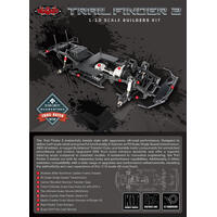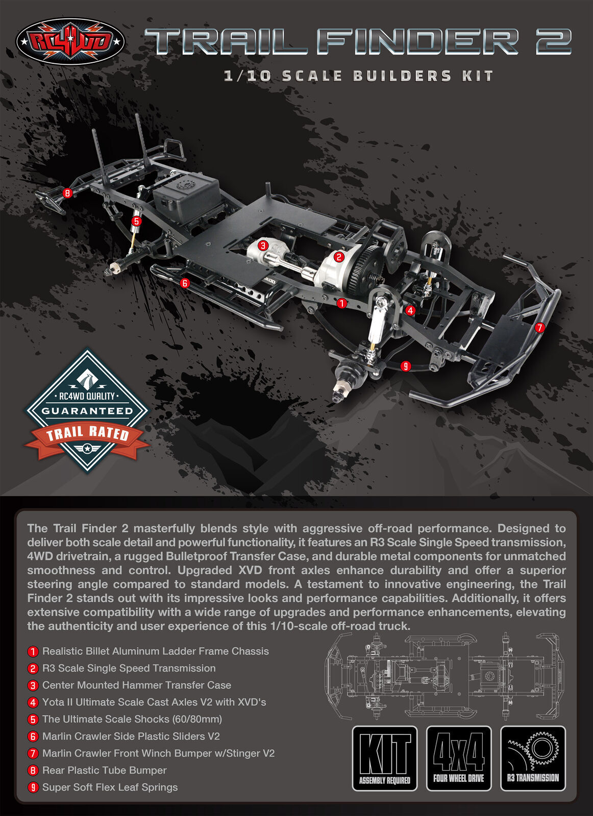 The Trail Finder 2 masterfully blends style with aggressive off-road performance. Designed to deliver both scale detail and powerful functionality, it features an R3 Scale Single Speed transmission, 4WD drivetrain, a rugged Bulletproof Transfer Case, and durable metal components for unmatched smoothness and control. Upgraded XVD front axles enhance durability and offer a superior steering angle compared to standard models. A testament to innovative engineering, the Trail Finder 2 stands out with its impressive looks and performance capabilities. Additionally, it offers extensive compatibility with a wide range of upgrades and performance enhancements, elevating the authenticity and user experience of this 1/10-scale off-road truck. Realistic Billet Aluminum Ladder Frame Chassis R3 Scale Single Speed Transmission Center Mounted Hammer Transfer Case Yota II Ultimate Scale Cast Axles V2 with XVD's The Ultimate Scale Shocks (60/80mm) Marlin Crawler Side Plastic Sliders V2 Marlin Crawler Front Winch Bumper w/Stinger V2 Rear Plastic Tube Bumper Super Soft Flex Leaf Springs Hammer Transfer Case Ratio: 1.47:1 Gears: Wide .8 Mod Steel Gears Features: 8 Bearings, Cast Casing, Hardened Gears R3 Scale Single Speed Transmission Ratios: Pinion/Spur 14/64 = 1:4.57 Internal Ratio: 1.78:1 Gears: Wide Steel .8 Mod, Delrin Spur, Slipper Clutch Yota II Ultimate Scale Cast Axles Ratio: 15/40 = 2.67:1 Width at Hex: 178.2mm (7.01"") Trail Finder 2 Chassis Features: Billet Aluminum Construction, Adjustable Shock Hoops Drive Shafts High Quality Plastic Material, Durable Steel Yokes Trail Finder 2 Truck Dimensions Wheelbase: 287mm (11.2"") Width: 196mm (7.7"") Height: 148mm(5.8"") Final Drive Ratios: 31.9:1 DRIVETRAIN The R3 Single Speed Transmission comes with a tough cast metal case and wider gears for durability and a Delrin Spur with Slipper Clutch for performance. It also features a sturdy billet aluminum motor mount for added toughness. The Trail Finder 2 Chassis includes the Hammer Transfer Case that features a cast metal exterior and heavy-duty .8 Mod Widened Gears, ensuring lasting functionality. Drawing on the success of the RC4WD MOA Gear Sets, the Trail Finder 2 Chassis has the most durable gears RC4WD has to offer, capable of staying on the trail day after day. The most scale accurate axles on the market, the RC4WD Yota II Ultimate Scale Cast Axles (XVD) feature innovative 8 degree round knuckles, unique removable diff covers, lower mounting points and a compact offset pumpkin in the front. The driveshafts found on the Trail Finder 2 Chassis feature heavy-duty uni-joint metal shafts for great driveline angles and durability on the trail. SUSPENSION The axles are now designed to accommodate leaf springs in two configurations: Over the axle for an off-road appearance and under the axle for a street look. This dual design eliminates the need to flip the axle, providing ease of use. The Trail Finder 2 Chassis includes a set of RC4WD Ultimate Scale Shocks. These ultimate scale shock absorbers offer realistic looks and performance. They are machined from billet aluminum with internal springs and rebuildable internal parts! With strength in mind, the ladder frame design of the Trail Finder 2 Chassis is made with CNC machined, billet aluminum and comes with scale shock hoops, a chassis servo mount, and transmission and transfer case mounts. Soft Steel Leaf Springs are constructed from high-quality material to reduce stiction. The unique sizing for this set is designed for a more finely tuned ride. The RC4WD Marlin Crawler Side Plastic Sliders for Trail Finder 2 V2 are scale replicas designed to protect and mitigate the rough impacts of crawling over rocky terrain and trails! Shown with Chubby Mini 3 TON Scale Jack Stands (Z-S0731) for example (Not Included) Shown installed with RC4WD 1982 Toyota Pickup Hard Body Complete Set (Z-B0257), Stamped Steel 1.7"" Beadlock SR5 Wheels (Chrome) (Z-W0065) and RC4WD BFGoodrich All Terrain K02 1.7 Scale Tires (Z-T0107) for example (Not Included) Shown installed with RC4WD Chevrolet Blazer Hard Body Complete Set (Z-B0092) (Painted Black), Stamped Steel 1.7"" Beadlock SR5 Wheels (Chrome) (Z-W0065) and RC4WD BFGoodrich All Terrain K02 1.7 Scale Tires (Z-T0107) for example (Not Included) What's Included: 1x RC4WD Trail Finder 2 Truck 1/10 Scale Builders Kit This is a kit that requires building time (appro. 2-3 hours), electronics, tires and wheels. Required to Complete: Truck Kit Hex Drivers (1.5mm, 2mm, 2.5mm) Long Nose Pliers Associated Thread Locking Adhesive Cross Wrench or Nut Driver (4mm, 5.5mm, 7mm) Electronics Motor (35t, 45t, or 55t) Radio and Receiver (3 Channels or more) (3 Channel Z-R0009, or 4 Channel Z-R0006) 2x Twister High Torque Metal Gear Digital Servo (Z-E0035) Battery (Consult your ""ESC"" manual) Z-E0090 or Lipo battery Charger (Consult your battery guide) Chargers Suggested Bodies RC4WD Chevrolet Blazer Hard Body Complete Set (Z-B0092) RC4WD 1982 Toyota Pickup Hard Body Complete Set (Z-B0257) (Z-K0069)