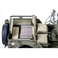 Scale enthusiasts will appreciate the detailed pre-painted and pre-assembled body, featuring functional lights, servo driven steering wheel and a fold-away windshield. Small features such as the fabric straps that hold the painted axe and shovel add to the realistic look and feel of the vehicle. The cabin replicates the real vehicle with micro-print instruction labels, gear levers and seating that fits 1/6th scale soldiers.