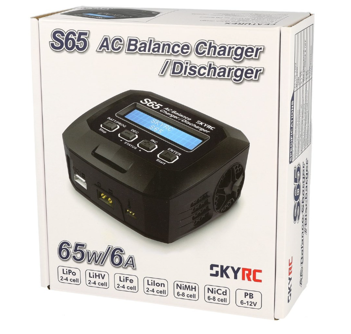 SkyRC S65 AC Professional Charger/Discharger stands out for its angular design and compact size by packing a big power of 65 watts into such a small case. Compatible with a full range of the most popular battery types, including the new generation LiHV, the S65 keeps your batteries powered up with 6-amps of charging power.