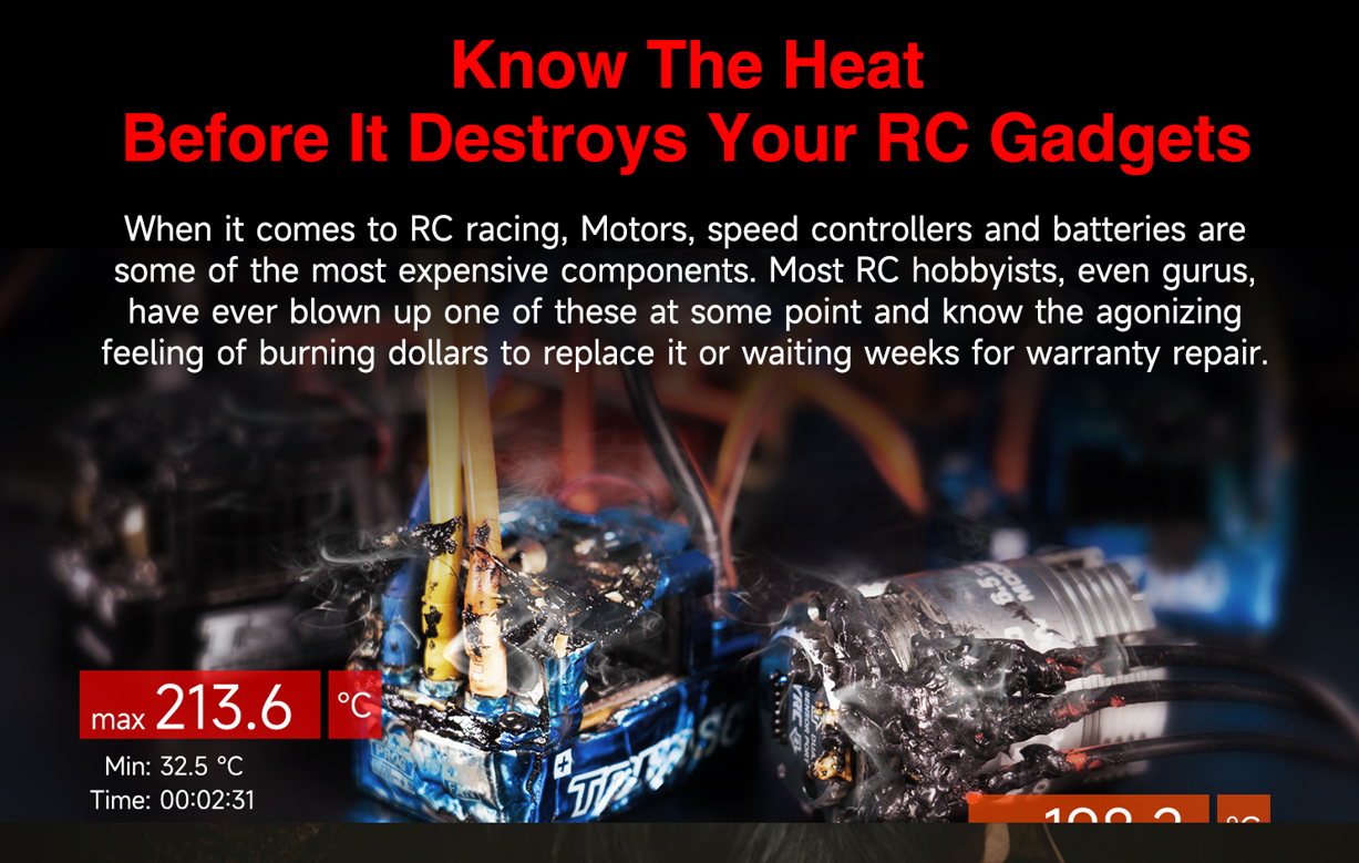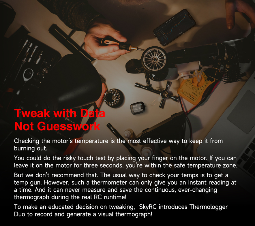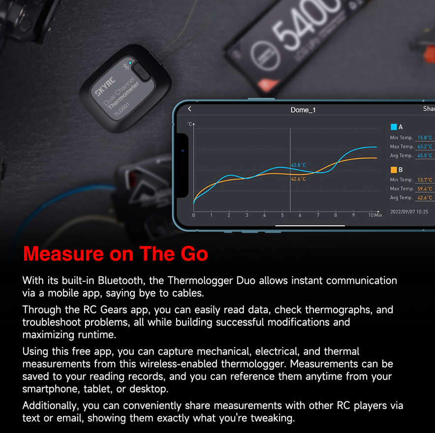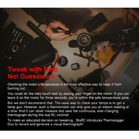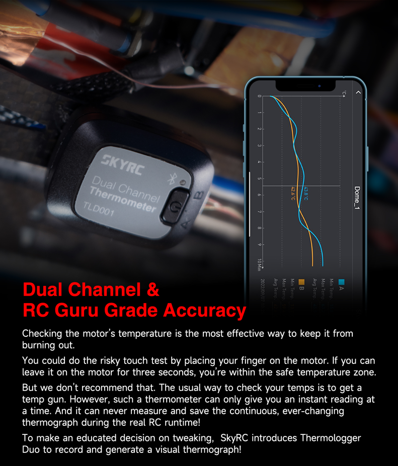 Product information ""SkyRC Thermologger DUO TLD001"" It is a well-known fact that electronics and heat do not mix well, so it is always an advantage if the motor and controller are as cool as possible during operation. After all, that affects performance and longevity. To help drivers monitor temperatures, SkyRC has developed the Thermologger Duo. In contrast to the well-known infrared thermometer, the thermologger offers the advantage that it not only measures the temperature at a specific point in time, but records and monitors it throughout the journey. With this thermograph created in this way, the course of the temperature is displayed in an easily understandable way. The Thermologger Duo offers precise temperature measurement with amazingly short reaction times at two different points at the same time. A high level of accuracy for temperatures between -20°C (-4°F) and 100°C (212°F) with a deviation of ±2.0°C (35.6°F) is of course essential when creating the graph. The data can then be called up wirelessly via the RC Gears mobile app from SkyRC. Features: Ideal helper to protect Your motor and ESC Quick temperature monitoring - At any time Equipped with two thermocouple wires for measuring at two different points Data can be conveniently accessed via Bluetooth and the ""RC Gears"" app Operated with a CR2450 button cell battery for up to 96 hours of continuous measurement Technical Specifications: Working Voltage: 2.4V - 3.6V Working Current: <4.6mA @ 3V DC Battery Type: CR2450 3V Lithium Coin Battery Measurement Range: -20°C ~ 210°C (-4°F ~ 410°F) Measurement Accuracy: -20 ~ 100°C (-4 ~ 212°F): +/-2°C (35.6°F) >100°C (212°F): +/- 2% Thermocouple Cable (Length): 30cm Thermocouple Cable (Type): Typ K Communication: BLE 5.0 Range: <15m Temperature (Operating): 0°C ~ 40°C (32°F ~ 104°F) Humidity (Operating): 5% ~ 90% Temperature (Storage): -10°C ~ 50°C (14°F ~ 122°F) Humidity (Storage): 1% ~ 75% Size: 38x30x16mm Weight: approx. 17.5g (SK-500043)