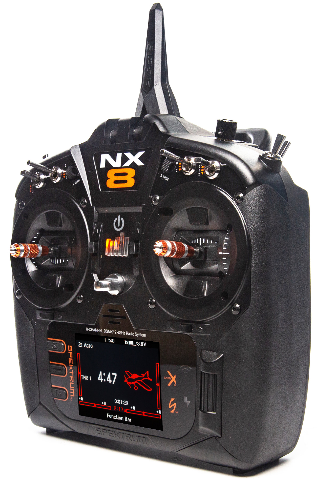 With 250 model memory, model programming templates, programmable voice alerts, wireless trainer system functionality and more, the NX8 puts a wide array of control innovations and advantages into the palms of your hands. Fly your aircraft with next-generation performance ¢ ¬ choose the Spektrum ¢ ¢ 8-channel NX8 transmitter.