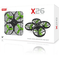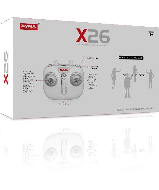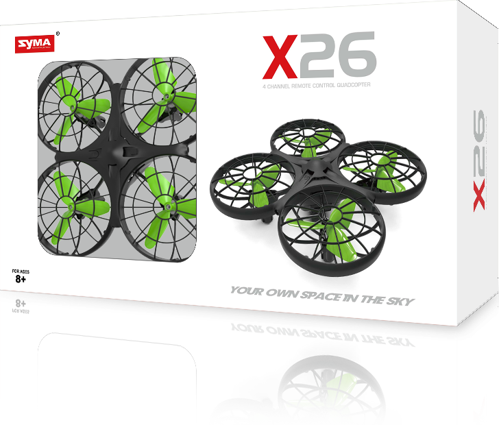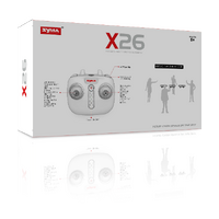 DOUBLE PROTECTION 1. Low Battery Protection: When the indicator lights are flashing, it means Syma X26 is in low battery. At this time, please return Syma X26 to home with your controller. If the battery is insufficient for returning home, Syma X26 will be landed automatically . 2. Overcurrent Protection: When the propeller of Syma X26 is being knocked / jammed while in flying mode, the over- current function will automatically stop the movement of the propeller to protect the damage of the drone itself. Item No.: X26 Battery: 3.7V 380 mAh Li-poly (included) Charging time: About 90 minutes Transmitter Battery: 4""AA"" batteries(not included) Controlling distance: About 70 meters Flying time: About 6 minutes Box Size: 32.8 X 17.6 X 7.6 cm Product Size: 13.1 X 13.1 X 4.45 cm Frequency: 2.4G Aircraft Remote Control Main Blade USB Charge Instruction Manual Syma X26 Battery USB Charge Instruction Manual Battery (SYM-X26)