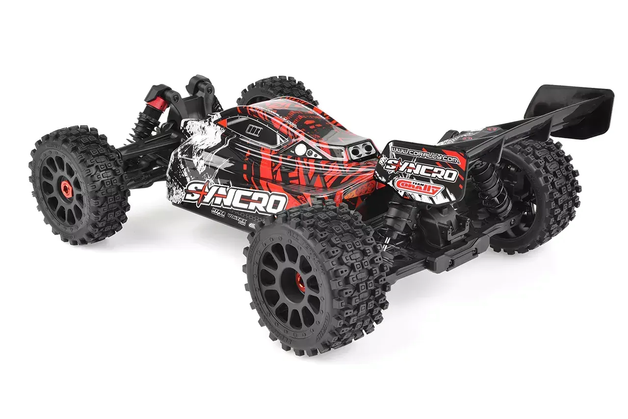 SYNCRO Unleash Your Inner RC Racer! Are you ready to dive into the world of RC racing? The Team Corally Syncro is ready to make your first steps unforgettable! Designed for both newcomers and enthusiasts, this 4S powered, 1:8 scale 2WD buggy combines professional-grade engineering with user-friendly features to deliver an experience thats as fun as it is rewarding. Built on the trusted platform of the Syncro4, the Syncro simplifies the action with a pure 2WD setup, making it the perfect choice for those ready to unleash their inner racer. Whether youre mastering your first jumps, carving tight turns, or testing your speed limits, the Syncro offers unmatched control, durability, and excitement - all at an unbeatable value. Ready-to-Run, Built for Fun! Straight out of the box, the Syncro is ready to hit the track. Its advanced PULSE G2 135 ESC delivers smooth, responsive power, while the powerful Kuron 725 brushless motor ensures youll always have speed to spare. With the robust HV7225 digital servo handling the steering, youll enjoy precision control on any terrain. Confidence in Every Turn The Syncros CT2S transmitter is designed with beginners in mind, featuring adjustable power settings (50%-100%) to match your skill level. Whether youre learning the basics or pushing your limits, this compact, easy-to-use controller ensures a smooth and enjoyabledriving experience every time. Your Perfect First RC Car The Syncro is the ultimate way to start your RC journey. Built on the trusted Syncro4 platform, this 2WD buggy combines simplicity, durability, and pure racing fun. With specially designed wheelswider at the rear for grip and narrower up front for precise steeringits built for easy handling and exciting performance. Lightweight, agile, and topped with a striking polycarbonate body, the Syncro is available in vibrant red, green, blue, and orange color options. Its the perfect choice for drivers of all ages, ready to help you unleash your inner RC racer! Built Tough for Endless Fun Every part of the Syncro is designed with durability and performance in mind. Its rugged suspension system, inspired by Team Corallys high-performance 6S lineup, features heavy-duty suspension arms, reinforced steering blocks, and durable rear hubs. These components work together to handle jumps, bumps, and rough terrain with ease. The big bore composite shocks and sturdy shock towers keep the buggy stable, while the lightweight yet strong chassis ensures its ready to tackle any adventure. Add in features like a high-performance slipper clutch and steel drivetrain components, and the Syncro is as reliable as it is exciting to drive. Key Features: User-Friendly 2WD Design Ready-to-Run Professional-Grade Electronics All-new PULSE G2 135 ESC Adjustable Power Settings Proven 1:8 Scale Platform Durable and Reliable Striking Design available in 4 colors Oil-filled 16mm composite Big Bore shocks with locking spring perches Sturdy composite front and rear shock towers Optimized independent pivot ball suspension Striking polycarbonate body in multiple color schemes Adjustable Central slipper clutch for controlled power delivery Proven, 6S based, rear differential design Specially designed wheels with wide rear and skinnier front for optimal 2WD traction and handling Your RC Adventure Starts Here! Whether youre new to the RC world or looking for a reliable, fun-to-drive buggy to kick off your hobby, the Syncro is the perfect choice. Combining professional-grade engineering with a beginner-friendly design, its everything you need to Unleash Your Inner RC Racer! Visit our showroom at world.corally.com for detailed information, product highlights, and everything you need to know about the Syncro! General Info Brand Team Corally Barcode 8718057255404 Item Nr C-00289-B Car - Model Type Age Requirement Age 14+ Assembly Time No Assembly Required Car Type Buggy Completion Level RTR - Ready To Run Drive Train 2WD Motor Type Brushless Power System 3S 2S 4S Recommended Environment All Terrain Skill Level Beginner Top Speed (km/h) 80 Car - Dimensions Battery Compartment LxWxH (mm) 161x51x38 Front Shock Length (mm) 106 Ground Clearance (mm) 50 Height (mm) 185 Length (mm) 515 Model Scale 1/8 Scale Rear Shock Length (mm) 129 Rim Dia. ø (mm) 90 Rim Width (mm) 57 Shock Dia. ø (mm) 19 Tire Dia. ø (mm) 117 Tire Width (mm) 59 Track Front (mm) 320 Track Rear (mm) 332 Weight (g) - No Battery 3300 Wheelbase (mm) 327 Car - Electronics Charger Not Included (See accessories) Motor Kuron 725 - 2150KV - 2-4S (Included) Power Battery Not Included (See Accessories) Radio TC - CT-2S 2.4GHz (Included) Servo CR-7225 - 25Kg Torque (Included) Speed Control TC - Torox 135 2-4S (Included) Car - Tech Details Bearings Full Ball Bearings - Rubber Shielded Differentials 1x Gear Differential + Center Slipper Clutch Front Suspension Type Independent - Pillow Ball Type Gear Pitch MOD 1.0 Internal Drive Ratio 3,31 Motor Pinion (T) 13 Overall Drive Ratio 11,71 Rear Suspension Type Independent - Wishbones Shock Type Oil Filled Composite Shocks - Coil Over Springs Spur Gear (T) 46 Wheel Adapter 17 mm Hex Adapter Car - Materials Bevel Gear - Pinion Steel - Powder Metallurgy Casting Bodyshell Polycarbonate - Painted, Decalled and Trimmed Chassis 3mm - Aluminium 6061-T6 - Color Anodised Chassis Braces Molded Composite Differential Center Differential FR - RE Molded Composite Case Lower Arm Holders 3mm 6061-T6 Aluminium + Composite Motor pinion Precision CNC Machined - Hardened Steel Outdrives Hardened Steel Shock Tower - Front Molded Composite Shock Tower Shock Tower - Rear Molded Composite Shock Tower Spur Gear Steel - Powder Metallurgy Casting (C-00289-R)