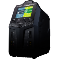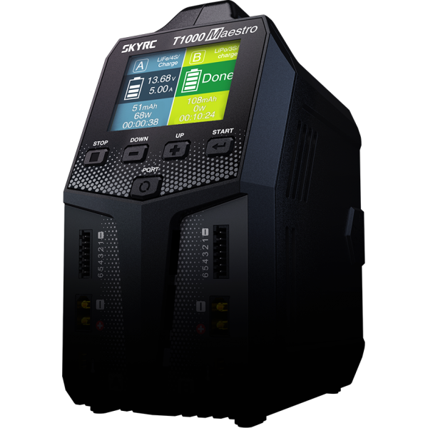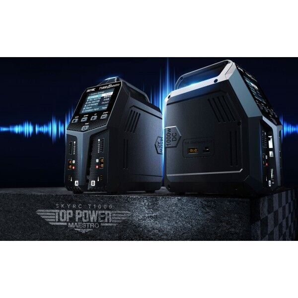 32 -BIT Core Processor ; 1 To 240 Interrupts, plus NMI ; 12 Cycle interrupt latency Multiplied by proprietary Hyperboost Thanks to the 200 MHz ARM Microcontroller, the deployed Oversampling Technology can improve ADC Resolution to 16bit. The efficient PID mechanism can fine-tune the current to increase response speed and the charge current accuracy. Dual AC/DC input Get ready to work, play, and race with SkyRC T1000 to pump the speed and power beyond you ever imagined! Your battery packs have been fully charged while you are still brewing coffee! That is how you get supercharged by co-designing hardware, software, and MCU. 20A per port Dual ports work independently to charge two battery packs efficiently and simultaneously. RC hobbyists can flexibly choose AC or DC input according to the scenarios. In AC mode, the charging power is up to 450W, while the performance is even more powerful, up to 1000W in DC mode. Whether you are a beginner or an RC guru engaging in racing, it is the charger to push the limits of what is possible! Smart power distribution When a single port works, the T1000 will be pumping full power into that port! The charging power is dynamically and intelligently distributed in the circumstance that two ports work at the same time. Whenever either port finishes working, the other port will fully charge at full power. The total power is always used intelligently and efficiently! Charging is so flexible! Digital power supply T1000 is not only professional in charging but also can act as a digital power supply. After clicks on the menu, T1000 is ready for your application, offering an optimal voltage of 5-27V with 0.1V increment, adjustable 1-15A current. Short circuit, Overload, and Reverse polarity protection are all included! Color X display & intuitive UX Discover a new ColorX interface introduced by T1000 based on simple and textured visuals! The tailor-designed light cyan and green color scheme is for RC charging. It helps you focus on the setting. The Web2.0 responsive menu and well-designed icons make the operation more suitable for players accustomed to operating smartphones! Time to say bye-bye to dull typography and welcome bold and beautiful brand-new UI. Charging doesn't have to be boring, and neither does life! Smart thermal fan Within the sleek enclosure lies a groundbreaking thermal system designed to let Arm Cortex-M4 fly through heavy workloads at screaming-fast speeds and stay whisper quiet. The fan will adjust the speed accordingly and dissipate heat more effectively according to the different power usage. Stunningly sleek With the classic, minimal, and sleek vertical tower design, T1000 frees up more bench space for RC hobbyists to tweak gadgets by taking the footprints of a pair of battery packs. Sleek design serves your charging and delights your charging! The ergonomic handle makes it easy to store, carry, and travel with. SPECIFICATIONS Input Voltage AC 100-240V (50/60Hz) DC 10-30V Input current 35A max Charge power AC 450W max DC 1000W max Discharge power Main port 10W Balance port 37W max External discharge 350W max Charge current LiPo/LiFe/LiIon/LiH V/NiM H/NiCd/Pb 0.1-20.OA parallel 20.0-35.OA Discharge current LiPo/LiFe/LiIon/LiH V/NiM H/NiCd/Pb 0.1-2.OA External discharge *Working with external discharger BD350 which can be purchased separately. 0.1-40.OA Balance current LiPo/LiFe/LiIon/LiH V 1.5A max Battery type LiPo/LiFe/LiIon/LiH V 1-6S NiMH/NiCd 4-15S Pb 3S/6S/12S Operation LiPo/LiFe/LiIon/LiH V Balance, Charge, Discharge, Storage, Parallel NiMH/NiCd Charge, Cycle, Re-peak, Discharge Pb Normal, AGM charge, Cold charge, Discharge DC Output Voltage 5-27V current 1.0-15.0A Size L*W*H 190.3*153.5*100 mm Weight 1370 gr DATA SHEET Manufacturer : SkyRC COMPOSITION KIT T1000 unit AC power cord User manual (SK-100182)