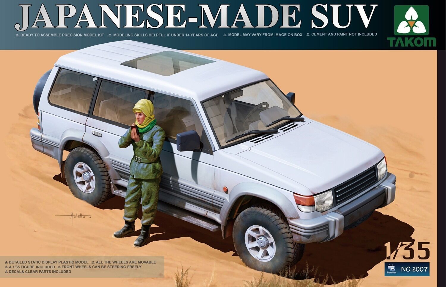 We have a modern generic Japanese-made SUV in 1/35! This highly detailed static model kit contains 59 precision injection styrene parts in tan, 13 in clear, 4 rubber tires, and water-slide decals for the dashboard. Special features include steerable front wheels, and seperate front doors & rear hatch, which can be assembled open or closed. A bonus figure of an armed Middle-Eastern female in military fatigues is included. Excellent for dioramas! This model kit requires assembly, and cement & paint are not included. Recommended for ages 14 & up.