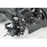 The bathtub frame of the evolved shaft-driven 4wd tt-01 type-e has its motor and battery close to the ground for lower center of gravity and optimum balance. Mounted on the bathtub frame is a fiberglass reinforced nylon upper deck and gear covers improving rigidity, as well as a 3-piece tie rod providing a smoother steering action. The low center of gravity, great balanced design, 4-wheel double wishbone suspension system, and front and rear differential gears all come together to produce excellent operating ability. 70mm-diameter radial tires are paired with wheels developed just for this model; the high sidewalls make for forgiving turns.
