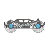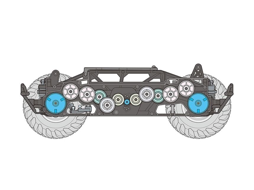 the gear-driven 4wd gf-02 chassis features its motor in a low, central position in the lightweight, durable monocoque frame, and transmits power to front and rear via gears. The long wheelbase and wide tread setup ensure stable off-road performance. The slim frame features ladder/pipe motifs and features integrated sealed gearboxes which help keep stones out. Front and rear gear differentials allow smooth cornering, while separately sold pinion gears offer a choice from three types of gear ratios, and a motor guard enhances reliability off-road. The 4-wheel double wishbone suspension employs four friction dampers, and the steering servo is positioned on the left with identical-length tie-rods.