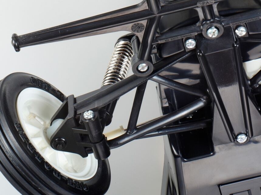 a rugged abs resin chassis is more than up to the stresses of off-road driving, and features lightweight durable plastic suspension arms, gearboxes and so on - the result is a lightweight and durable unit. Front swing axle and rear rolling rigid suspension combine for a responsive drive, while a fully enclosed gearbox is integrated with the rear axle and has a built-in differential gear to aid smooth cornering. One-piece wheels are paired with front grooved and rear spike tires for solid performance.