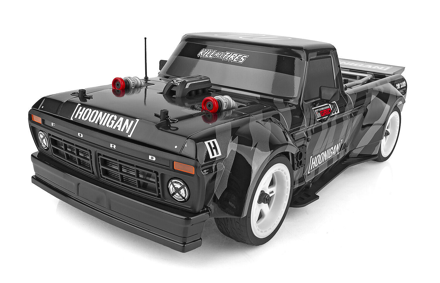 The Apex2 chassis has been updated from our previous version with the latest features in on road racing. A front and rear independent suspension with threaded oil-filled shocks and active rear toe give the Apex2 the ultimate in handling on uneven tarmac. This makes it a perfect platform for the Hoonitruck and tire-shredding action!