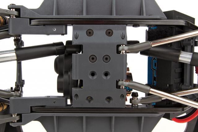 What makes the Enduro Gatekeeper Buggy RTR special? The all-new Gatekeeper Suspension package (GKSTM)! This package consists of rear trailing arms that move the shocks forward, allowing a larger window for shock tuning and providing improved weight bias. The trailing arms are paired with a rear anti-roll bar for a more stable and consistent suspension when crawling on the rocks. An adjustable aluminum track bar mount firmly bolted to the chassis rail gives the Enduro GK more reliable and responsive steering without the flex. Our shock mount inserts with multiple mounting positions allow for precise suspension tuning, whether it's moving the shocks up, down, forward, or back.