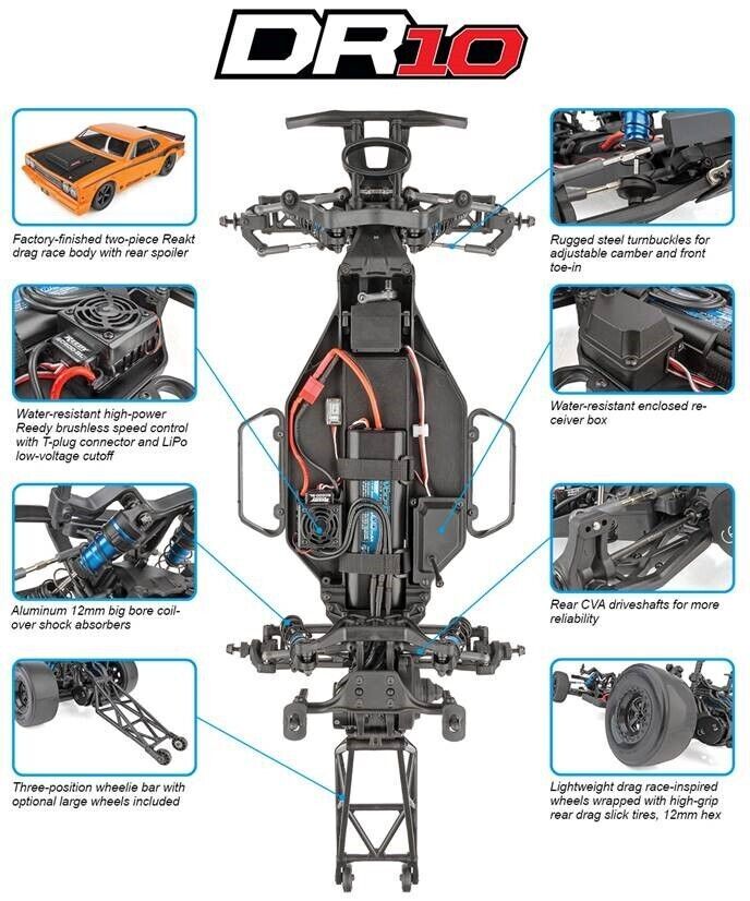 Based on the 9-time R.O.A.R. Short Course National Championship platform, the DR10 Drag Race Car features a water-resistant high-power Reedy brushless speed control and 3300kV brushless motor, a 2.4GHz 2-channel radio system, as well as our ALL NEW DVC (Dynamic Vehicle Control) receiver unit with built-in adjustable digital gyro. Add to that a Reedy metal-gear, digital, high-torque servo and a water-resistant enclosed receiver box.