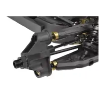At the heart of the Kagama Limited Edition is its uncompromising 7075 aluminum backbone - a foundation engineered for extreme durability and precision handling. The gold-anodized 7075 aluminum chassis not only provides unmatched strength but also delivers an exceptional style. To further reinforce the structure, CNC-machined 7075 aluminum bulkheads lock the drivetrain in place, preventing unwanted movement and ensuring smooth, reliable power delivery, even under extreme loads. Meanwhile, the 6mm 7075 aluminum shock towers, paired with the new shock standoffs, provide rock-solid suspension support, allowing the proven Kagama shocks to absorb impacts consistently - no matter how hard you push the truck. Additionally, the 7075 Aluminum Servo Saver Bell Crank enhances steering precision and durability, ensuring direct and responsive handling in any driving condition.