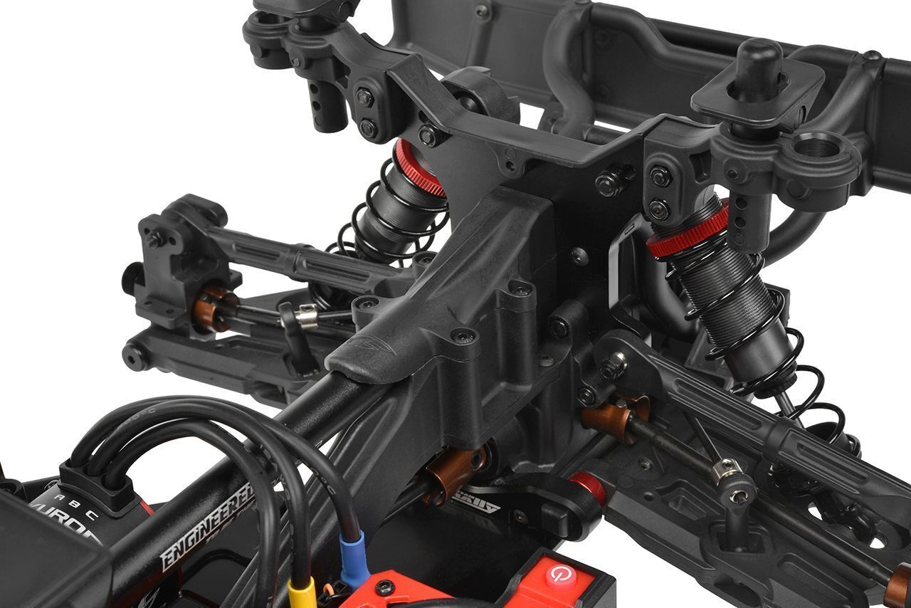 At the core of SHIROI lies a 3mm CNC-machined aluminum chassis, reinforced with a tower-to-tower brace and tall composite side guards. This rigid backbone is built to handle high-speed launches, rough terrain, and demanding landings with ease. A bulletproof steel drivetrain with CNC-cut gears, triple fluid-filled differentials, and durable CVD driveshafts ensures maximum efficiency and reliability on both 4S and 6S LiPo power.