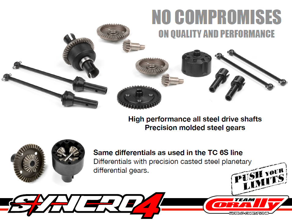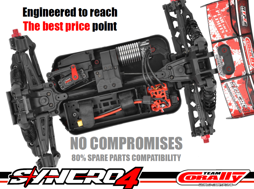 In crafting the Syncro4, Team Corally seamlessly blends proven components with innovative solutions, offering a harmonious mix of reliability and fresh design. Many elements, like the robust arms, steering blocks, and rear hubs, draw inspiration from our proven 6S lineup, ensuring a solid foundation. At the same time, newly redesigned shocks, towers, and other key features introduce a breath of fresh air. Notably, enthusiasts can easily update various components from the 6S lineup, adding a layer of versatility and personalization to the Syncro4 driving experience. In our commitment to innovation, we extend our focus beyond mechanics to aesthetics, incorporating striking features like anodized in titanium color, laser-etched chassis, ensuring your Syncro4 not only performs outstandingly but also stands out in style.