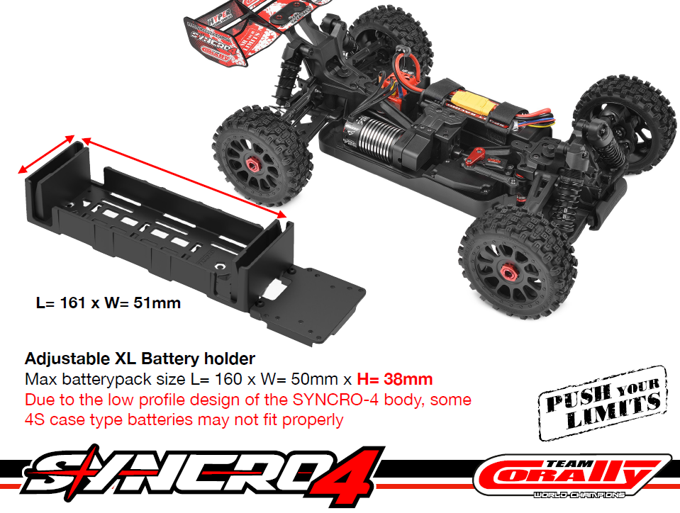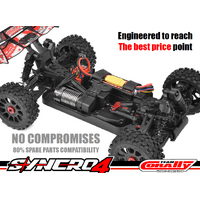 Introducing the Team Corally Syncro4, a groundbreaking 1:8 scale bash buggy engineered for enthusiasts seeking an extraordinary off-road experience without compromising quality or performance. This exceptional machine redefines the boundaries of budget-friendly RC cars, offering an unparalleled combination of affordability, durability, and handling. As part of Team Corally's highly regarded lineup, the Syncro4 inherits an enduring legacy of excellence, boasting over 80% shared parts with legacy models.