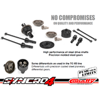 The Syncro4 commands the off-road domain with a formidable drivetrain built for relentless power and precision. Its steel outdrive cups, paired with robust central driveshafts, form the optimized backbone of a system designed for uncompromised strength and longevity. Precision-engineered CVD driveshafts in the front and durable metal dogbones in the rear ensure dynamic and reliable performance. Supported by aerospace-quality 8x16x5mm rubber-sealed ball bearings, the entire drivetrain maximizes efficiency and durability. The Syncro4's drivetrain components are shared with the Radix4, mirroring its geometry and tuning options akin to our top-notch 6S lineup.