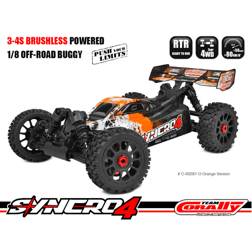 Discover the power and precision of the Team Corally Syncro4, a 1:8 scale buggy engineered for both beginners and seasoned enthusiasts. With over 80% of its components shared with Team Corally's flagship models, the Syncro4 introduces innovative features at an unbeatable price point. The introduction of new threaded composite big bore shocks, extreme composite shock towers, and a hybrid chassis brace system exemplify the perfect blend of durability, performance, and cost-effectiveness. The striking titanium-colored aluminum chassis, vibrant redesigned body, and flexible aerodynamic wing redefine off-road aesthetics. This buggy boasts a hybrid composite/aluminum motor mount, offering three motor position options for pinion alignment. The reinforced drivetrain, featuring steel outdrive cups and a robust 46T steel central gear, ensures exceptional durability. From the powerful Kuron 725 brushless motor to the Torox 135 ESC, every component contributes to an exhilarating top speed of 80+ km/h. The CT2S 2.4GHz transmitter, new chassis reinforcement system, and reinforced high-downforce wing complete the package. With the Syncro4, Team Corally continues its legacy of innovation, offering unbeatable performance without compromise.