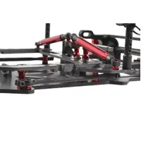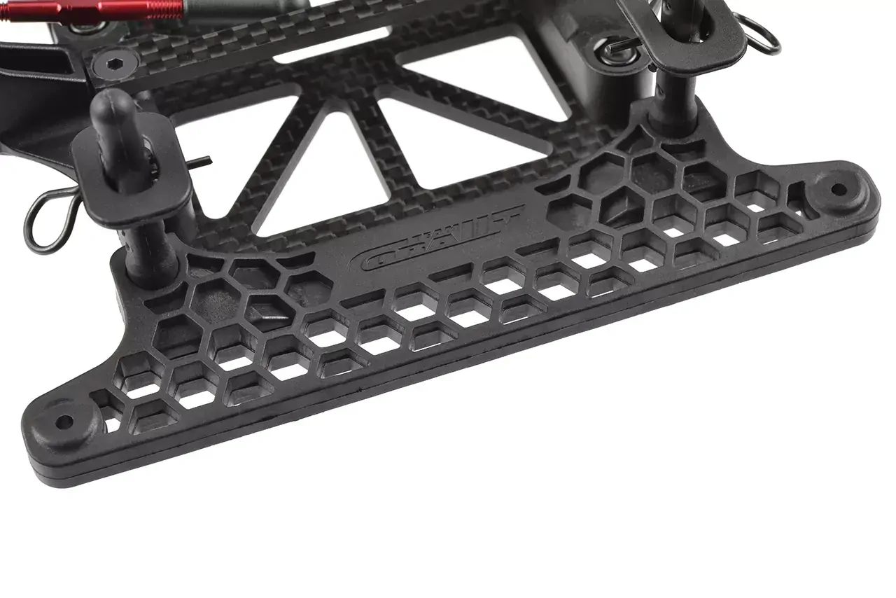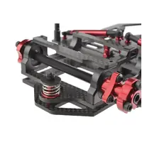 - Adjustable Chassis Flex: Carbon side braces mounted with aluminum posts let you tailor lateral chassis flex to track conditions. Loosen the top screws for more flex on bumpy or loose surfaces, or keep them tight on high-grip tracks for quicker corner exits.