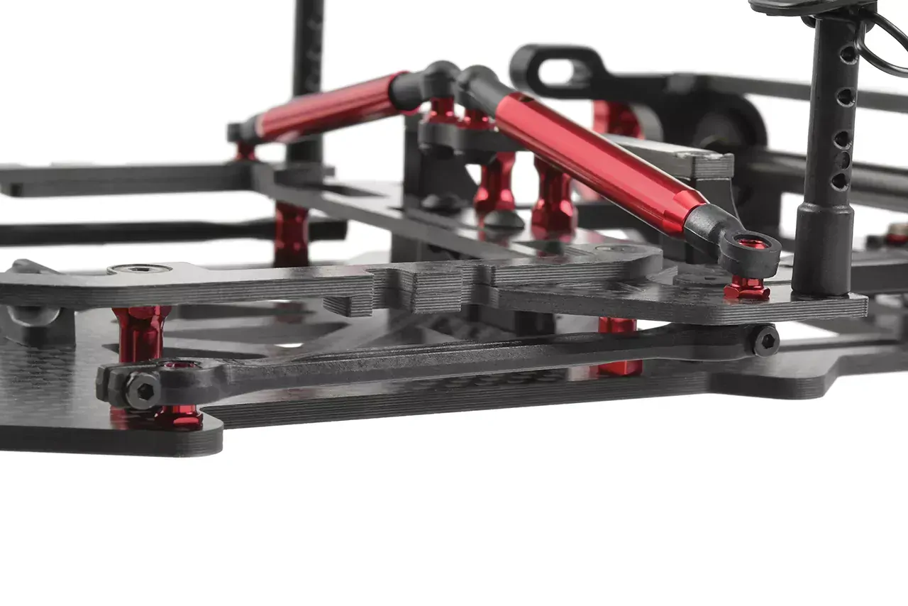- Link Suspension: Two composite side links, an aluminum central hinge, and carefully planned geometry provide smooth, precise movement in the rear. This classic setup is proven reliable for 1:12 scale racing.