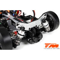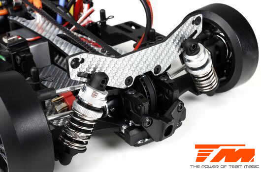 Team magic recently unleashed new production of their e4d mf drift car with a silver version. On this fantastic fabrication, the silver eco graphite i widely equipped in many sections of the car such as chassis, shock towers, front upper bumper mount and; upper deck. Compared with tradtional black colour parts, the appearance of eco graphite is more dashing, shiny, high-gloss looking, voguish and; the fashionability that will definately catch the owner's eye