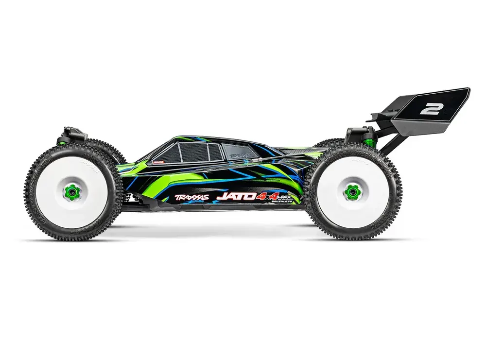 Jato 4X4 packs the same Velineon 540XL brushless motor found in the Maxx ® extreme monster truck. It s the largest motor Traxxas has ever offered in a buggy, and it s backed by a new VXL-4s ¢ speed control with built-in telemetry and selectable 6.0 or 7.4-volt BEC. With 4s LiPo power on tap, Jato 4X4 VXL defies the laws of physics as it rockets its way to 60 mph and beyond with unrelenting acceleration.