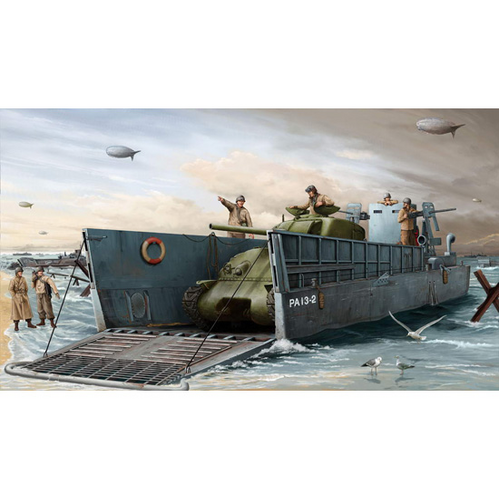 The LCM (Landing Craft Mechanized) was the most widely used type of tank-carrying landing craft in WWII and more than 8,500 were built in American yards between 1942 and 1945. As British had no tank-carrying craft lighter than LCT (Landing Craft Tank) s, LCMs were also readily adopted by Royal Navy. LCMs could be either carried on ship davits, or towed across the English Channel. Due to the danger of swamping in rough seas, most LCMs were towed across the Channel and not loaded with troops until the mornings of D-Day. LCMs could be readily identified by their unique perforated bow ramp. As tanks grew larger and heavier, the LCM (3) was developed with a longer hull and greater buoyancy, which allowed a 30-ton tank to be carried. They could also handle up to 30 tons of cargo or 60 troops. LCM (3) had a crew of 4 men and was armed with two 50-caliber machine guns. The LCM was not designed for the crew to live aboard and it remained dependent upon a parent ship over long periods of time. The most important role played by LCMs on D-Day was transporting the engineer teams assigned to demolish the beach obstacles.: