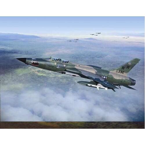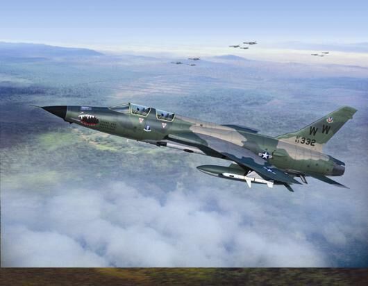 The F-105 evolved from a project begun in 1951 by Republic Aviation at Farmingdale NY to develop a supersonic tactical fighter-bomber to replace the F-84F. The massive F-105 was intended primarily for nuclear strike missions. The prototype first flew on October 22, 1955, but the first production aircraft, an F-105B, was not delivered to the USAF until 1958. The F-105D all-weather strike fighter and the two-place F-105F dual-purpose trainer-fighter were also built before F-105 production (833 aircraft) ended in 1964. F-105G aircraft were nicknamed Wild Weasels" and specialized in jamming enemy radar and destroying surface-to-air missile sites. Wingspan:10.6m Length:19.6m Height:6.0m Max Weight:23,967kg Speed:1,372mph(mach 2.1) Ceiling:14,783m Range:3,848km: