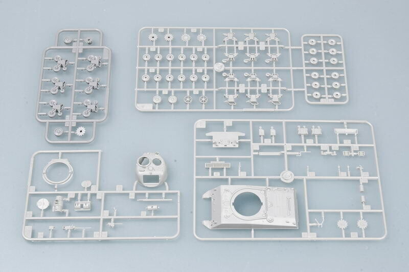 .The M4A3 mostly seen on the battlefield had the hull of a revised 47 degrees glacis armor arrangement and two larger hatches as compared to the old hull.Changes also took place in the prduction run to use a high bustle turret". T he armor on the right-hand side of the turret was thickened in the casting process to compensate the thinned down inner armor needed to mount the gun equipment. So the turret no longer spotted an added on applique armor anymore. The kit faithfully depicted this kind of turret and a choice to build the early hull without the front ventilator blower cover.