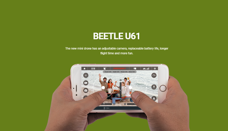 Drone Model: U61 Weight: 63g Flight Time: 6 to 8 minutes WIFI Distance: 20 to 30 m (Outdoor And Unobstructed) Hovering: Enabled Operating Temperature Rang: 0° to 40°C Dimensions: 140 x 140 x 43.5 mm Remote Controller Operating Frequency: 2.4 GHz Transmission Distance: 50 m (outdoors and unobstructed) Operating Temperature Range: 0° to 40°C Battery: 4×1.5 V Alkaline batteries AA Mobile Device Holder: Smart phones APP / Live View App Name: Flyingsee Image transmission system?2.4G wi? Real time image transmission?480 P@20 fps Operation System?This software is suitable for mobile phones in the IOS 9.0 or later and Android 4.4 or later system, Main Feature Aerial Photography, Altitude Hold Mode, Heading Hold Mode, Low Battery Alarm, Out of Range Alarm, APP Control, Real-time FPV, One button take off/landing, Up, Down, Forward, Backward, Turn left/right, Fly left/right Camera Image resolution?640×480P Static Photography Mode?Single shoot Video Resolution?640x480P Image mode?RGB Frame Rate?25 File System?FAT 32 Image format?JPEG Video format?MP4, H.264 TF Card?Unable Operation Temperature?0°C to 40°C Gimbal Stable?Adjustable camera Controllable range?Tilting?-90° to 0° Flight Battery Capacity: 500 mAh Voltage: 3.7 V Battery Type: LiPo Energy: 1.85 Wh Charging Temperature Range: 5° to 40°C Charging Time: 60 to 80 mins Charger Input?5V?2A (UDI-U61S)