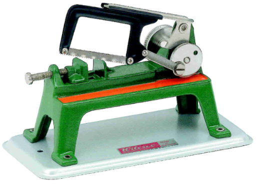 Toothed saw blade, adjustable chucks. Matches and small pieces of wood can be sawn.