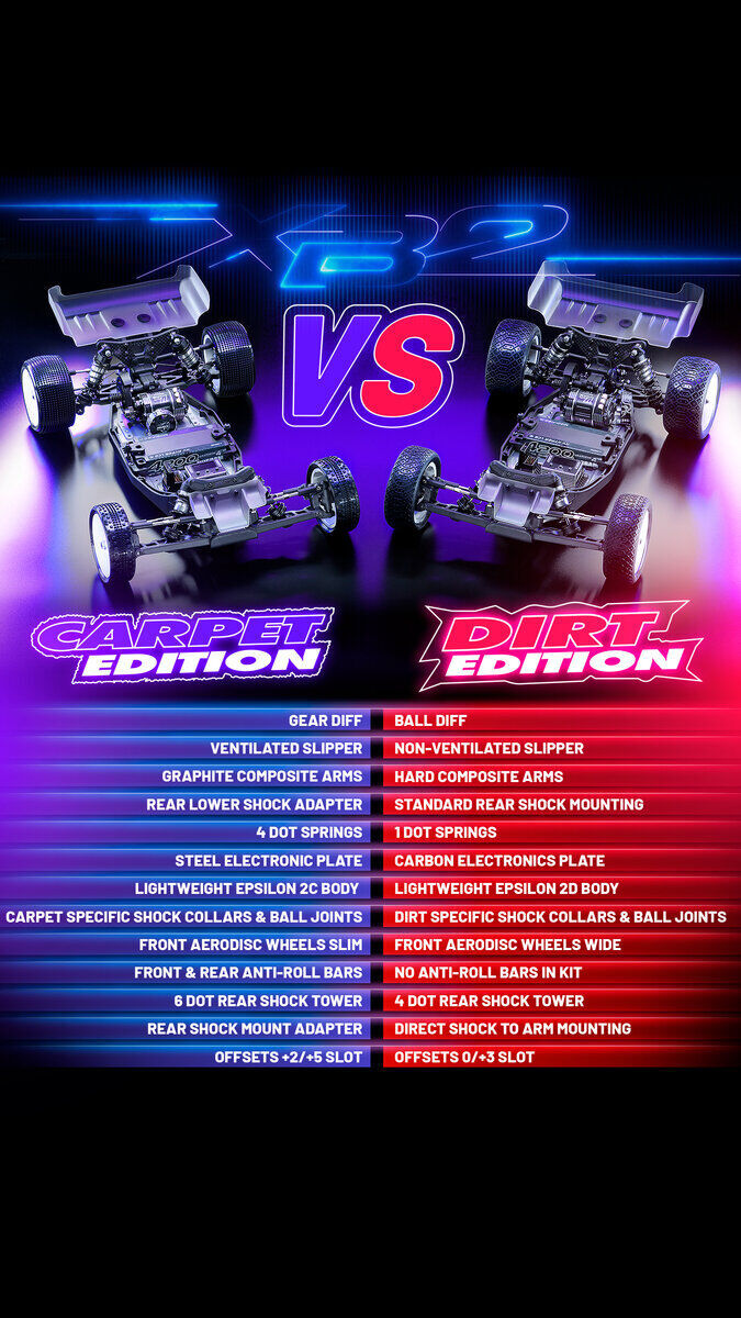 - All-new 2.5 mm chassis lineup with optimized flex — mid-size for carpet, short-size for dirt — engineered for maximum traction and control