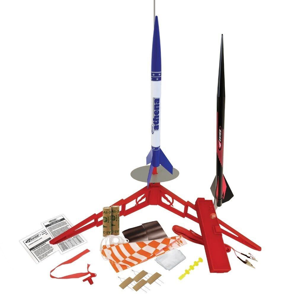 This starter set includes everything you need to launch the Athena and Xtreme rockets. It's designed to take a beginner rocketeer, build up their skills, and bring them deep into the world of rocket science. This starter set includes the launch pad, the launch controller, 2 A8-3 motors, 4 starters, 4 plugs, and 12 sheets of recovery wadding. Everything you need to experience an incredible launch day. The Athena is a Beginner's quick building rocket kit that requires no previous building experience and no paint. The Extreme is an Intermediate rocket kit that requires moderate assembly which includes gluing and painting.