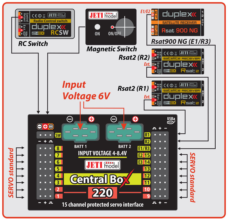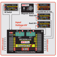The Central Box 220 has a unique design that provides overload protection at each servo output. The Central Box can manage up to two batteries and fully supports the JETI EX telemetry system. Up to three receivers with serial (PPM, EX Bus, S.BUS, UDI) output can be connected to the Central Box 220. With JETI DC/DS transmitter, the full potential of the Central Box can be used, such as an easy way to configure the Central Box, EX telemetry, and very fast servo response.